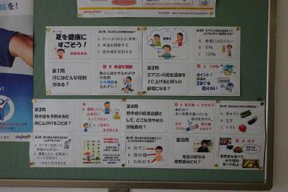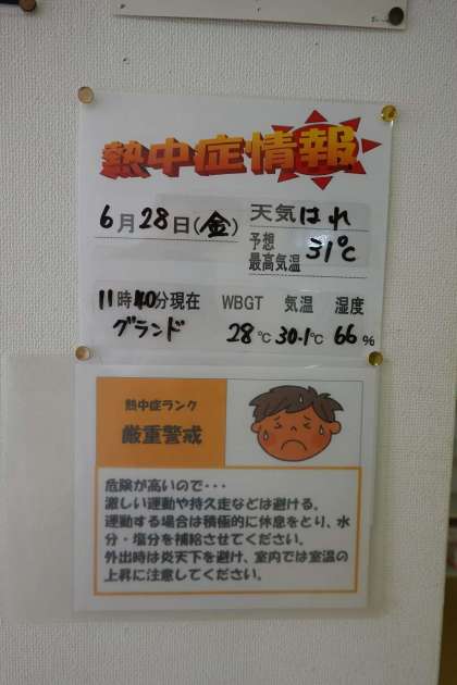 本校の養護教諭が、生徒への注意喚起で、熱中症計で計測した結果を掲示しています。