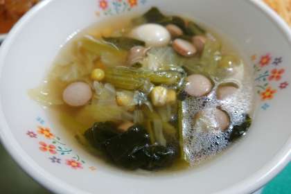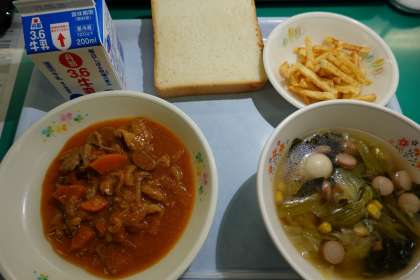 食パン、牛乳、メキシカンポークソテー、ウィンアート野菜のスープ