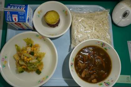 カレー南蛮、牛乳、ボイルドサラダ、ふかし芋
