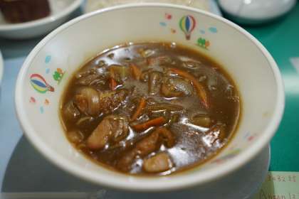 今日はカレー南蛮です。ミートソースと共に服にとばないよう気をつけて食べます。