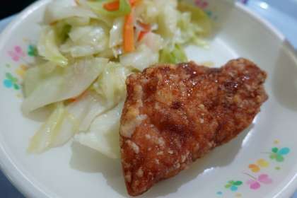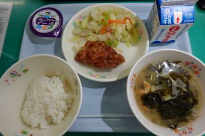 ご飯、牛乳、鳥の唐揚げ薬味ソースかけ、キャベツソテー、油揚げとじゃがいもの味噌汁、ブルーベリーゼリー