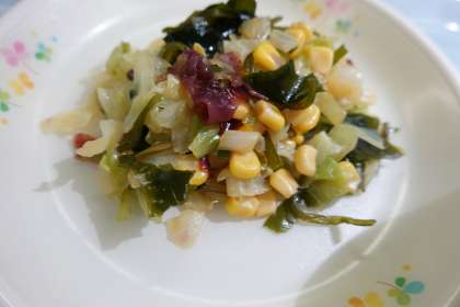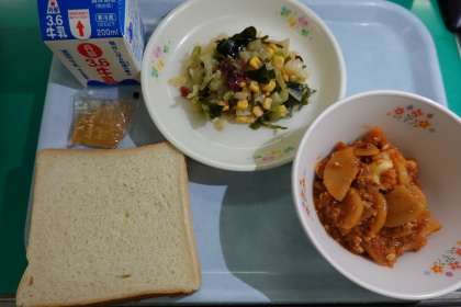 食パン、牛乳、ミートグラタン、海藻サラダ、リンゴジャム