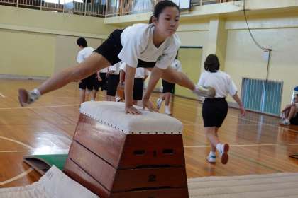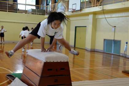 まずは、開脚跳びでウォーミングアップ。