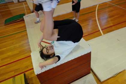 跳び箱。回転系の技を練習しています。