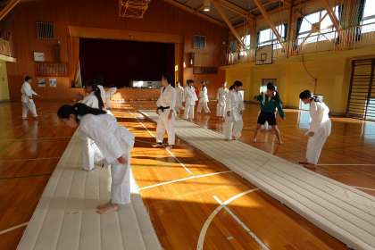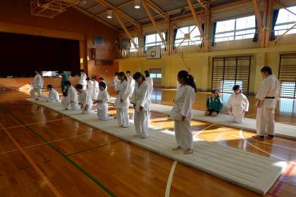 立ち方、座り方、礼の仕方を体育館で確認しました。