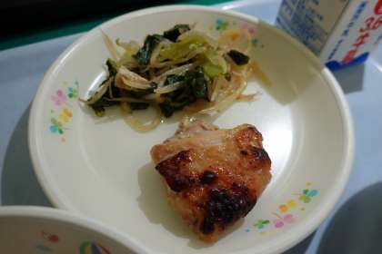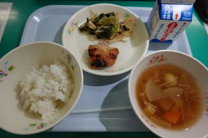 ご飯、牛乳、鶏肉の味噌焼き、煮浸し、薄くず汁