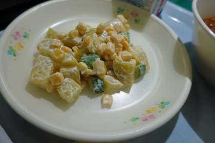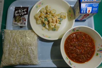 ミートソース、ソフト麺、牛乳、サツマイモのマヨネーズサラダ、アーモンド小魚