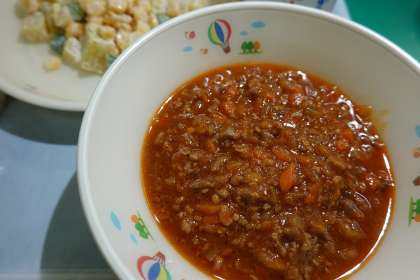今日はミートソース! 服に飛ばさないよう気をつけていただきます!
