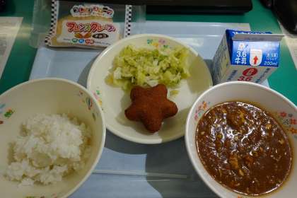 愛鷹小が今日で2学期最後の給食ということで「カレー」「星形コロッケ」もです。チョコクレープもついていました!