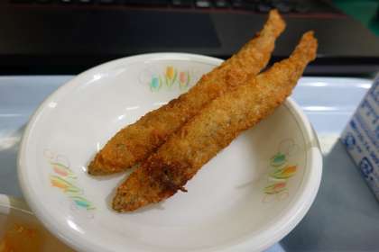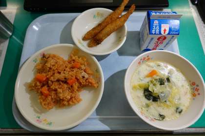チキンライス、牛乳、シシャモフライ、ミルクスープ