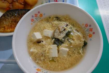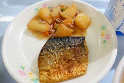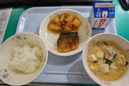 ご飯、牛乳、鯖のカレー焼き、ジャガイモそぼろ煮、かき玉汁
