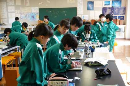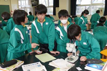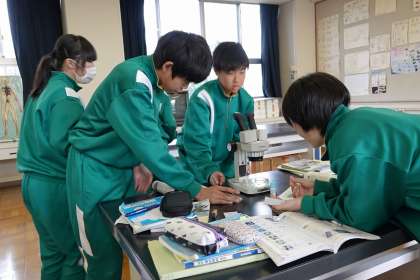 顕微鏡を熱心にのぞいています。