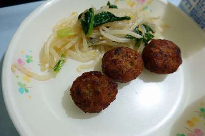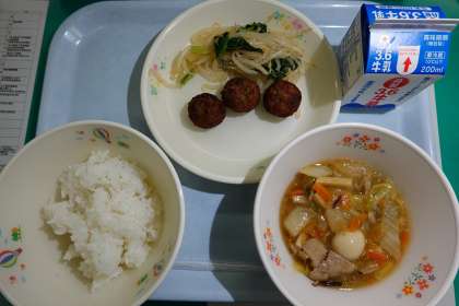 ご飯、牛乳、八宝菜、ひじき入り鶏つくね、ナムル