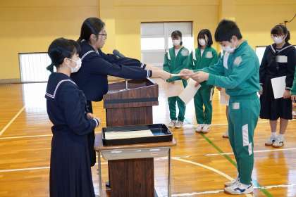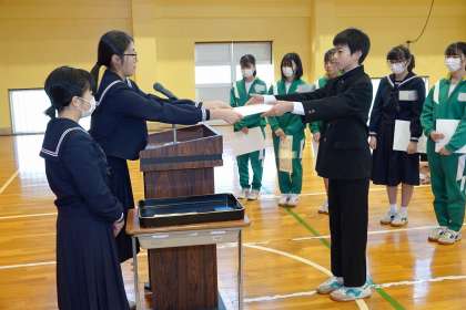 3学期始業式に行われた百人一首大会の上位取得者の表彰です