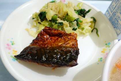 ご飯、牛乳、サバのみりん干し、ごま入りお浸し、味噌けんちん汁