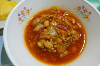 黒糖パン、牛乳、チリコンカン、プレーンオムレツ、ジャガイモと野菜のサラダ