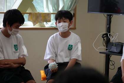 テーマは「幸せ」でボールを渡された生徒が発言し、発言してほしい人にボールを渡します。