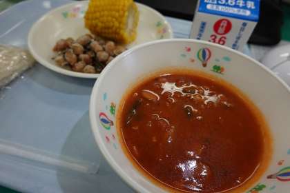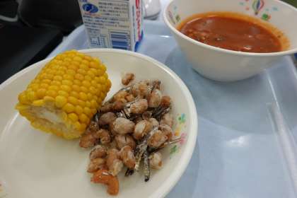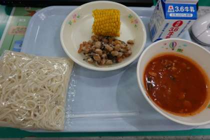 ソフト麺、牛乳、つけナポリタン、ゆでトウモロコシ、大豆とナッツの唐揚げ