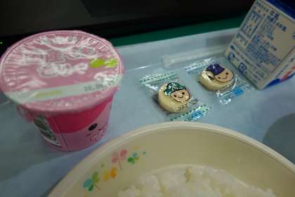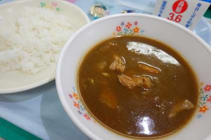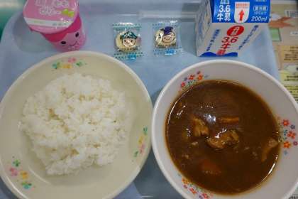ご飯、牛乳、チキンカレー、桃ゼリー、チーズ