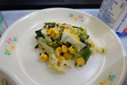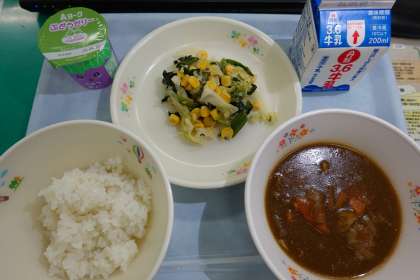 ご飯、牛乳、カレー、キャベツとベーコンのソテー、ブドウゼリー