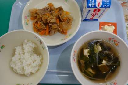ご飯、牛乳、豚キムチ、わかめスープ、チーズ