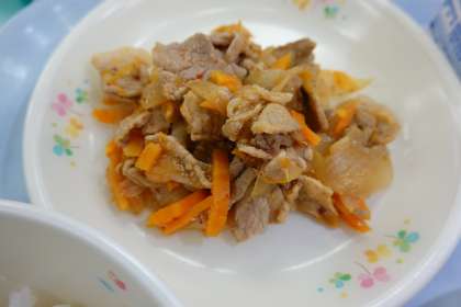 今日はぴりっとからい豚キムチです。わかめスープのよい味です。