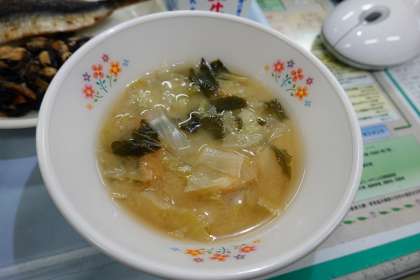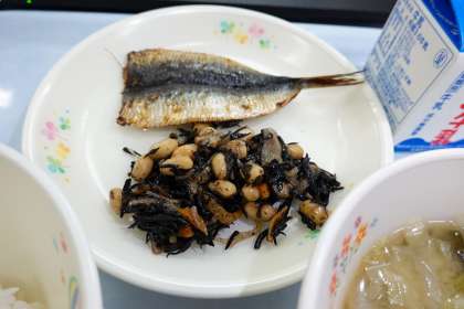 ご飯、牛乳、鰯のみりん干し、ひじきと大豆の炒め煮、キャベツの味噌汁