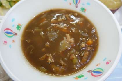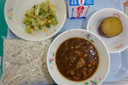 うどん、牛乳、カレー南蛮、キャベツとキュウリのサラダ、ふかし芋