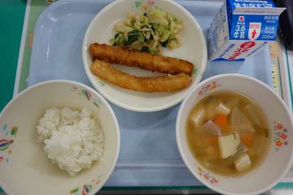 ご飯、牛乳、イカのさらさ揚げ、ごま和え、豚汁