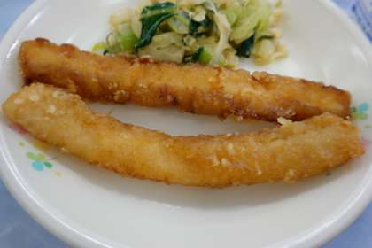 「さらさ揚げ」とは、カレー粉や調味料で下味をつけて、粉をまぶして揚げたものです。 仕上がりの色が、東南アジアの「更紗」という織物に似ていることから、この名前になったそうです。