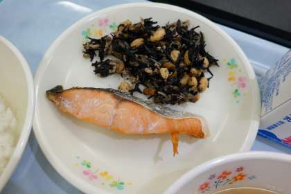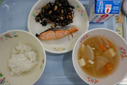 ご飯、牛乳、塩鮭、ひじきと大豆の煮物、のっぺい汁