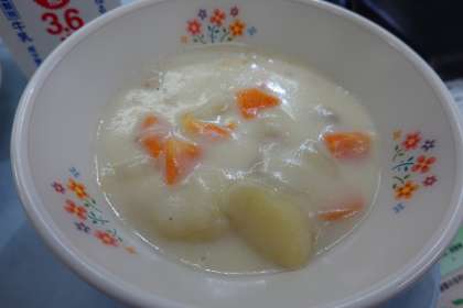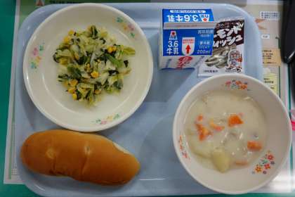 リンゴチップ入りロールパン、牛乳、クリームシチュー、野菜のソテー、アーモンド小魚
