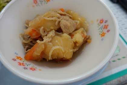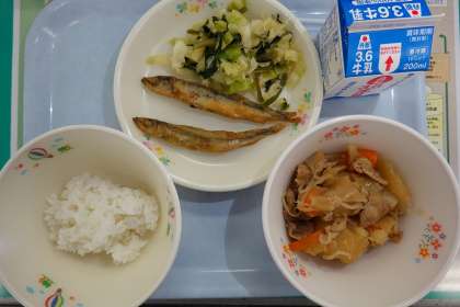 ご飯、牛乳、肉じゃが、シシャモの竜田揚げ、茎わかめと野菜の炒め物
