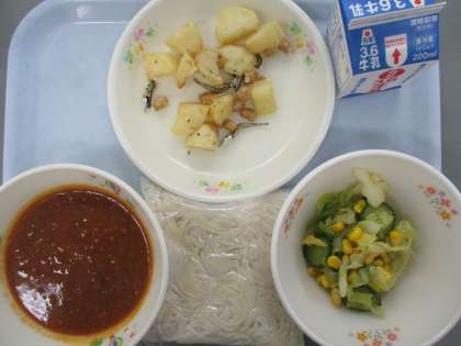 ソフトめん、牛乳、ミートソース、ポテトと小魚のからあげ、きゅうりとキャベツのサラダです。