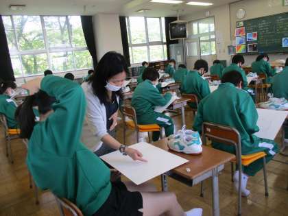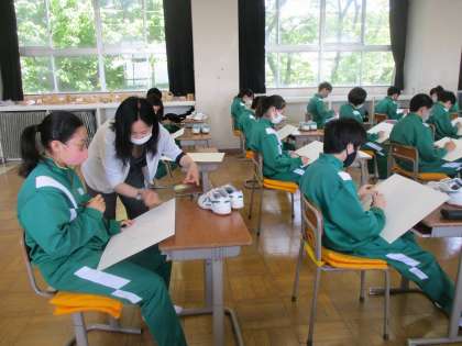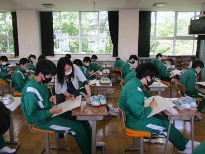 置き方を工夫したくつを、鉛筆を寝かせて、丁寧に描いていました。