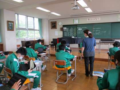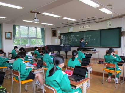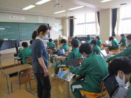 2年生が、音楽で、曲名「夏の思い出」についての学習をしていました。クロームブック使って、曲が表している風景は、どこの風景なのか、曲に出てくる植物はどんな植物かなどを調べていました。