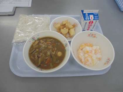 今日の給食はカレー南蛮です。 服に飛び散らないように。