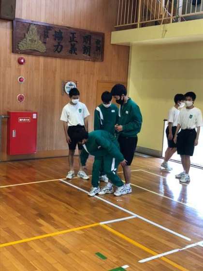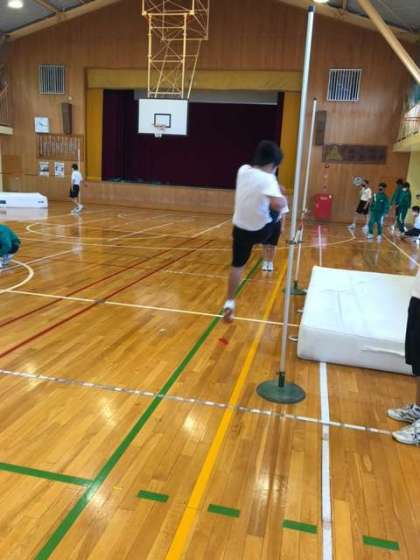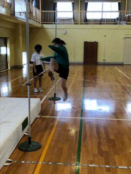 走り高跳びを行なっています。グループごとに跳び方の改善点を話し合いながら、キレイな跳躍ができるように工夫しています。