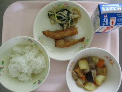 ご飯 牛乳 ししゃもフライ おひたし 野菜となまあげの煮物 でした。