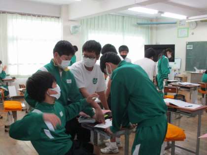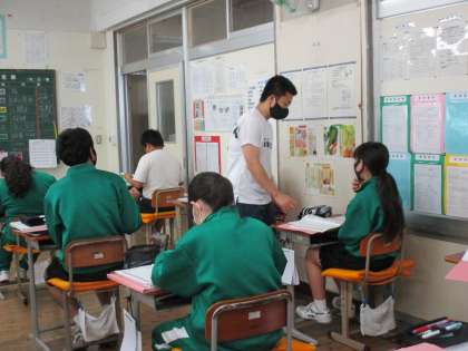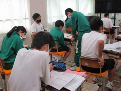 2年生が保健体育が授業で、体力テストの目標を考えていました。一人で考える生徒もいれば何人かで相談しながら考えている生徒もいました。