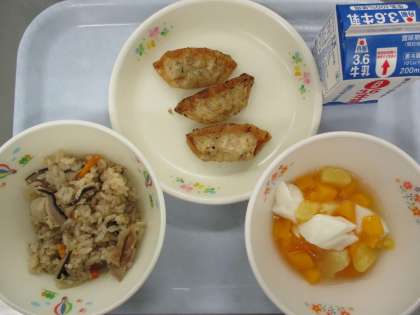 牛乳 中華たきこみご飯 餃子 フルーツ杏仁です。