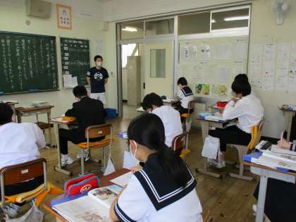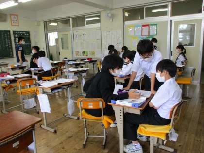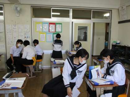 自分事として考える場面で、担任から「学校をよりよくするために何ができるか」という問いが出されました。それに対し生徒の皆さんは、「他学年との交流をさかんにすることができそうだ」「生徒会活動に協力することができそうだ」等様々な意見を出しました。
