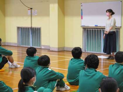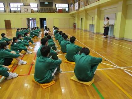 2年生が学活の時間に、体育館で、先生の話を聞いていました。