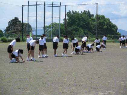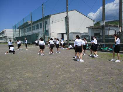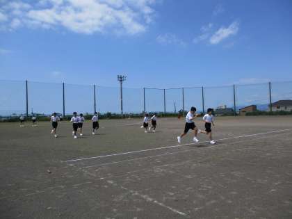1年生が保健体育の授業で、「50m走」と「ハンドボール投げ」のテストのための準備をしていました。