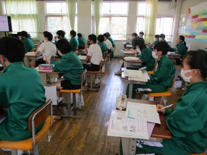 3年生が、家庭科の授業で「幼児の心身の発達と家族の役割」について学習していました。幼児に対してどのように支援したらいいのか、先生の話をしっかり聞いていました。