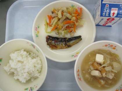 ご飯 牛乳 いわしの煮付け 豚肉と野菜の炒め物 もやしの味噌汁です。