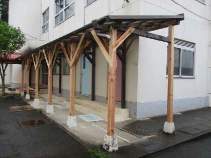 昨日、業者さんが来てくれまして、体育館を出たところのひさしの柱を修理してくださいました。