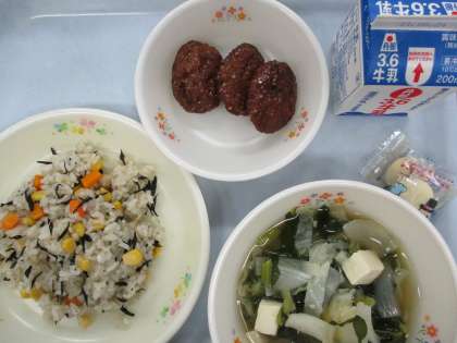 牛乳 ひじきとコーンのピラフ レバー入りつくね 豆腐と野菜の炒め物