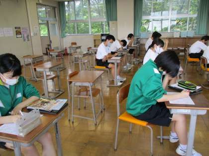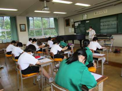 2年生が音楽の授業で期末テストの解説を聞いていました。
