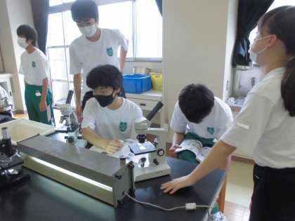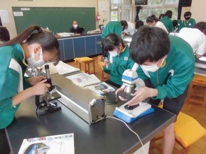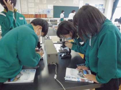 玉ねぎの細胞分裂を顕微鏡で観ています。